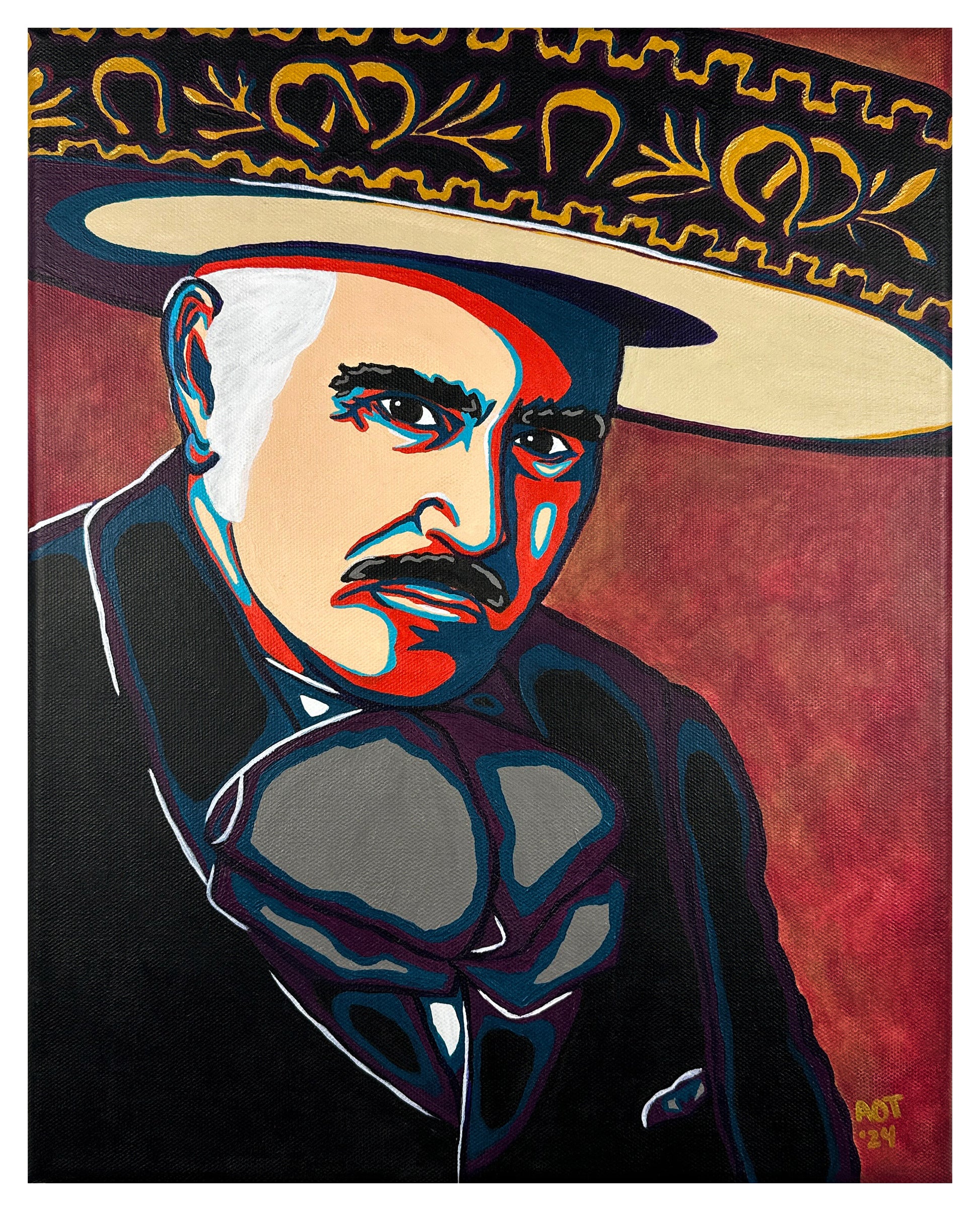 This bold painting, "El Rey", features iconic Mexican singer, Vicente Fernandez. Perfect for any fan of ranchera, a style of Regional Mexican music, this painting captures the essence of Fernandez's powerful presence.